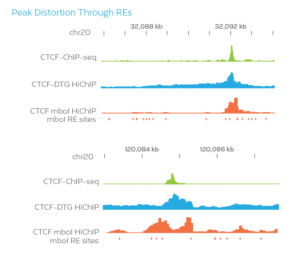 Approximately 20% of the mappable human genome is blind to Hi-C when using restriction enzymes (RE), since signal can be unduly influenced based on the availability of restriction sites close to the protein binding site. The Dovetail HiChIP MNase Kit overcomes this by using micrococcal nuclease (MNase), an enzyme with sequence-independent endonuclease and exonuclease activities, to uniformly fragment chromatin and get the highest resolution 3D genome architecture mapping (150 – 200 bp conformation).
