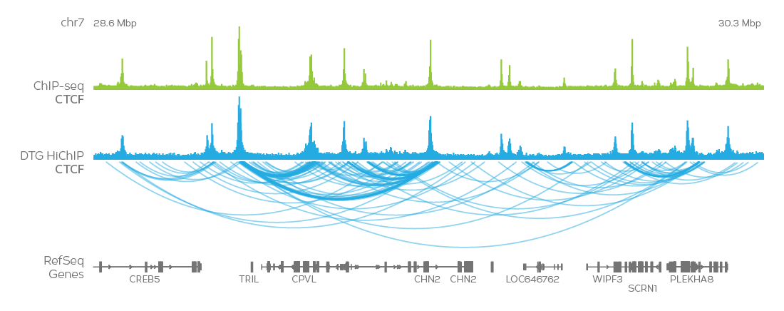 The Dovetail HiChIP MNase Kit combines the benefits of ChIP-seq with Hi-C, a proximity ligation method that captures long-range interactions using standard Illumina paired-end sequencing. Query protein-directed chromatin conformation mediated by specific proteins of interest and see your ChIP-seq data in a whole new dimension.