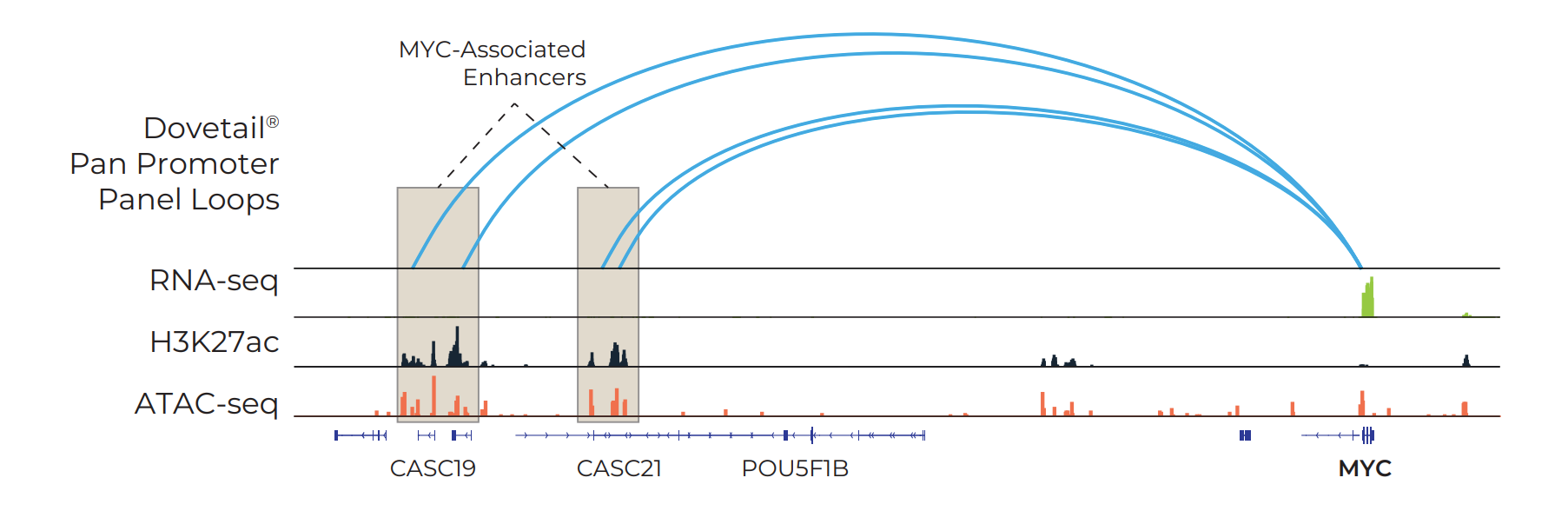 The power of promoter-targeted linked-read data is illustrated in the figure: interactions anchored at the MYC proto-oncogene promoter span more than 700 kb of sequence, identifying upstream regulatory regions. These regions align with enhancer (H3K27ac) and open chromatin (ATAC-seq) marks, while enhancer marks located closer to the MYC gene do not exhibit evidence of interaction.